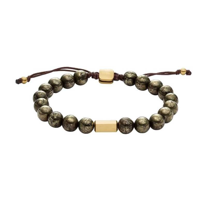 Pánský náramek Fossil s korálky pyritu v khaki odstínu přináší elegantní dotek do každého stylu. Ocelové komponenty s luxusním zlatým PVD povlakem umocňují jeho atraktivitu. Díky nastavitelné délce až 25 cm se perfektně přizpůsobí každému zápěstí, což zaručuje pohodlné nošení. Tento módní šperk nejenže doplní váš outfit, ale také podtrhne váš osobní styl a jedinečnost.