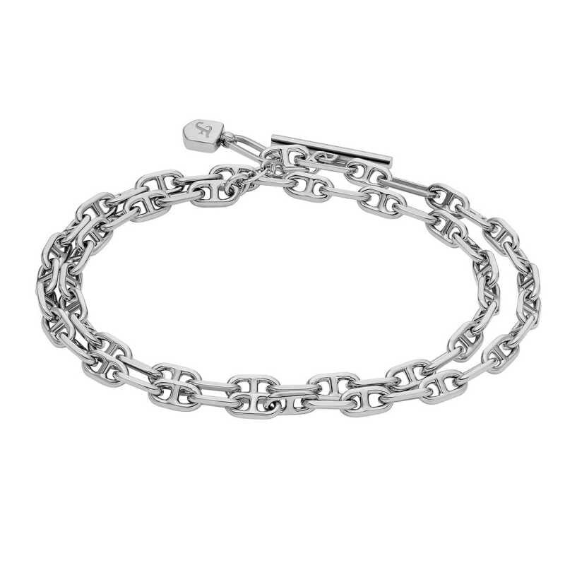 Elegantní dvojitý náramek značky Fossil je dokonalým doplňkem pro každou ženu, která ocení spojení kvality a stylu. Vyrobený z odolné oceli, nabízí unikátní řetězovinu typu Marina gucci. S délkou 35,5 cm a možností prodloužení o 3,5 cm se skvěle přizpůsobí vašemu zápěstí. Americké zapínání...