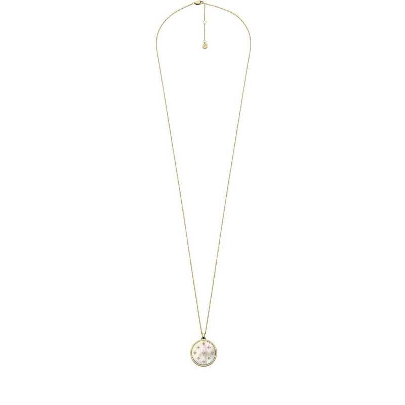 Dlouhý náhrdelník značky Fossil spojuje eleganci a kvalitu. Je vyroben z prvotřídní oceli a pokoven zlatým PVD povlakem, což zaručuje dlouhou životnost a atraktivní vzhled. Kulatý přívěsek s perletí a hvězdičkové motivy se čirými krystaly dodají každému outfitu šmrnc. S délkou 81 cm a možností...