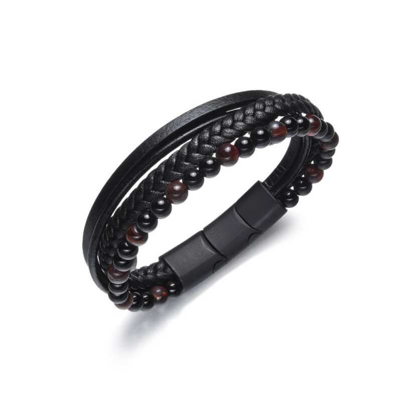 Pánský náramek značky Diverse kombinuje kvalitní ocel s elegantní designovou kůží v sofistikované černé barvě. Povrch z oceli je ošetřen černým PVD povlakem, což zajišťuje odolnost a dlouhou životnost. Náramek je ozdoben korálky z tygřího oka a achátu, které dodávají stylový akcent. S délkou 21...