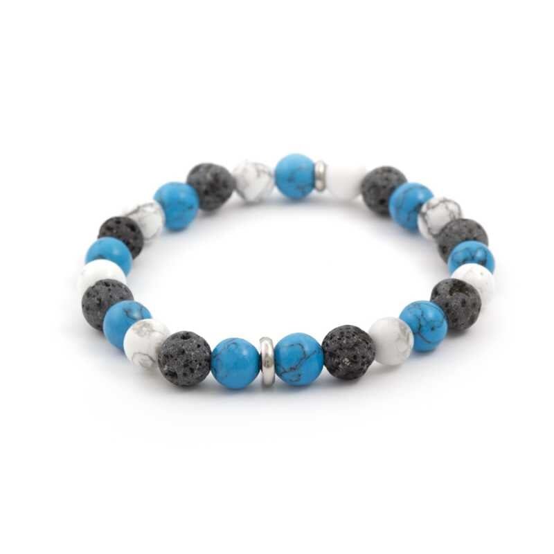Elegantní náramek značky Agato spojuje korálky lávového kamene s modrým a bílým howlitem, čímž vytváří stylový doplněk vhodný pro každou příležitost. Pružná gumička zajišťuje pohodlné nošení. Howlit přináší klid a harmonii, zatímco lávový kámen chrání před negativními vlivy a posiluje sebedůvěru. Tento šperk nejen ozdobí váš outfit, ale také podpoří vaše vnitřní zdraví a pohodu.