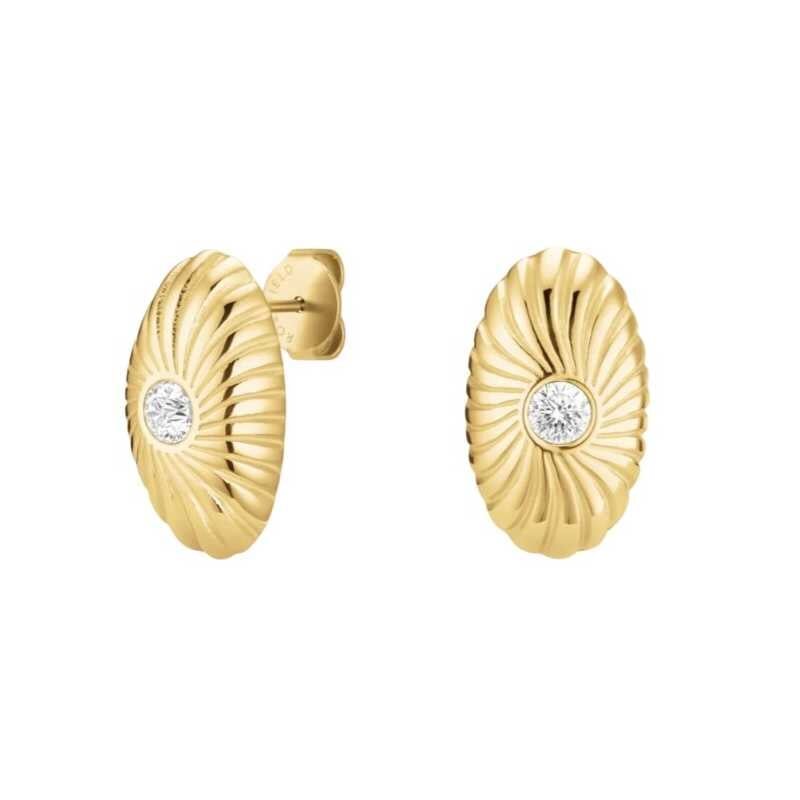 Elegance a nadčasovost se snoubí v originálních dámských náušnicích značky Rosefield. Vyrobeny z kvalitní oceli a pozlacené 14karátovým zlatem, tyto náušnice přitahují pozornost díky svému oválnému, mírně vypouklému tvaru a nádherným čirým krystalům. Zapínání pomocí puzetky zajišťuje pohodlné...