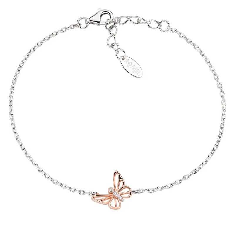 Elegantní dámský náramek značky Amen kombinuje kvalitu a styl. Vyrobený z kvalitního stříbra s rhodiovaným povrchem, který zajišťuje dlouhotrvající lesk a minimalizuje alergické reakce. Ozdoba v podobě motýlka, pozlacená růžovým zlatem a osazená čirými zirkony, dodává šperku jedinečný šarm....