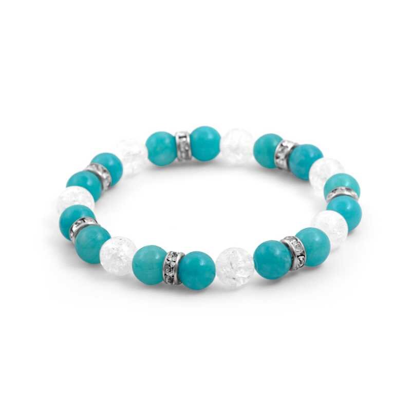 Náramek Agato, vyrobený z minerálních korálků jadeitu azurového a praskaného křišťálu, je elegantním doplňkem, který okouzlí každou ženu. Díky pružné gumičce se pohodlně nosí a skvěle se hodí k různým outfitům. Jadeit přináší pozitivní energii a lásku, zatímco křišťál harmonizuje a zklidňuje...