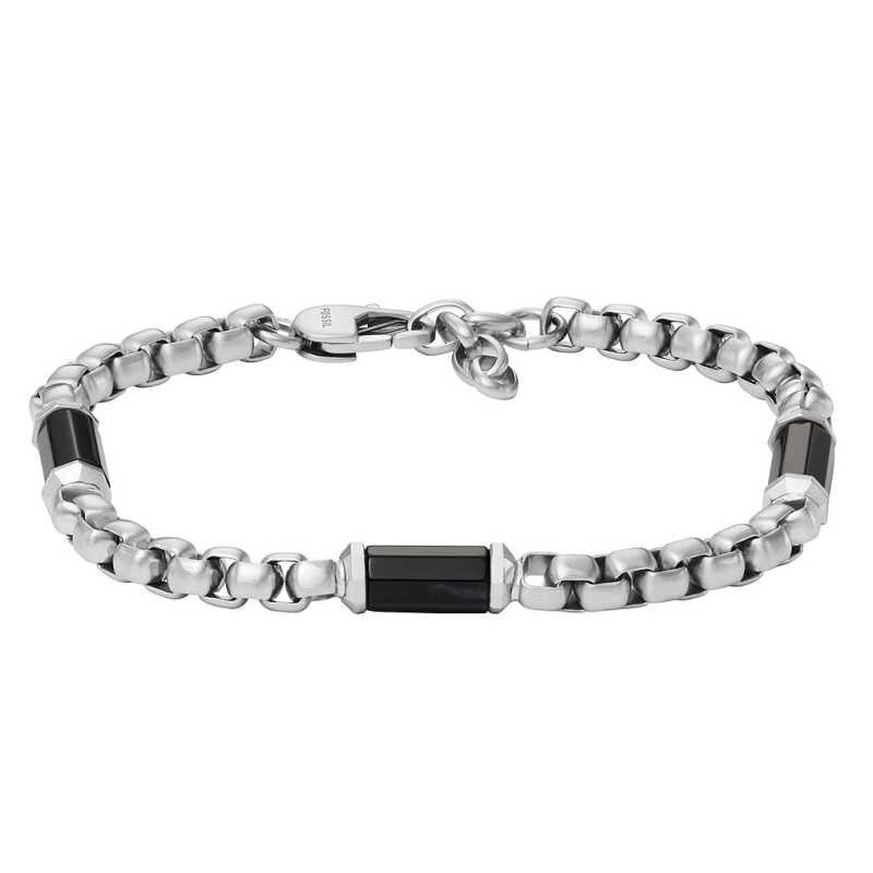 Pánský náramek značky Fossil přináší spojení elegance a kvality. Vyroben z odolné oceli, vyniká nadčasovým kostičkovým designem a černými válečky z achátu, které dodávají šperku jedinečný vzhled. S délkou 19 cm a možností prodloužení o 2,5 cm se skvěle přizpůsobí každému zápěstí. Zapínání na karabinku zajišťuje bezpečnost nošení. Obohaťte svůj styl tímto moderním doplňkem.