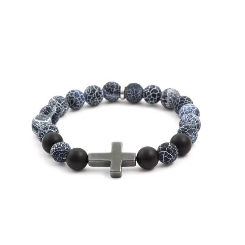 Elegantní náramek Agato pro ženy spojuje krásu minerálních korálků a oceli. Složení z šedého cracker a černého matného achátu s přívěskem křížku z hematitu nejen že okouzlí, ale také přináší pozitivní energii. Díky pružné gumičce se náramek pohodlně nosí a jeho délka 17 cm dokonale padne na...