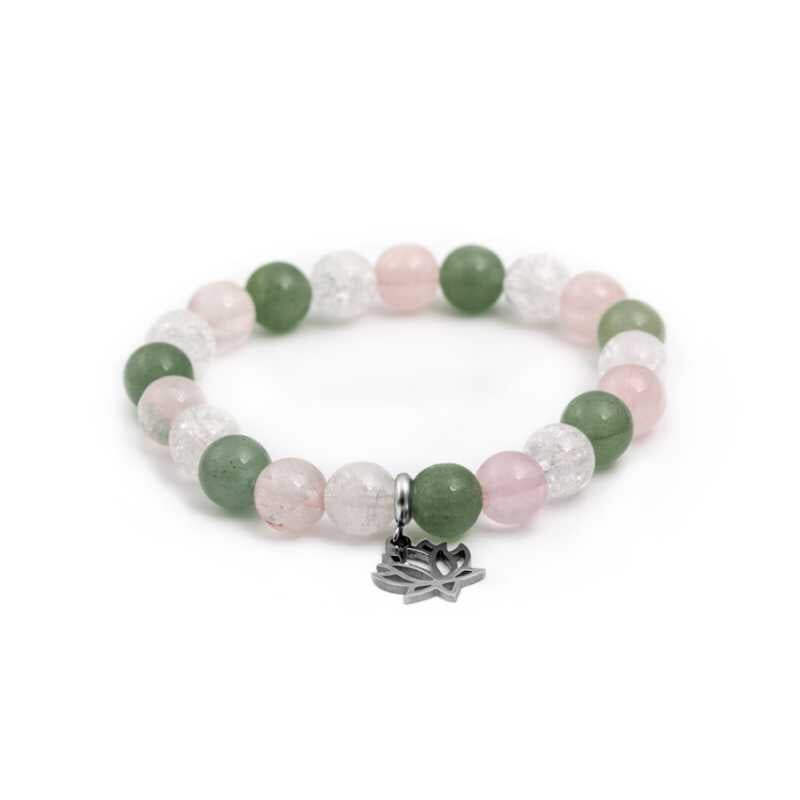 Elegantní náramek Agato pro ženy kombinuje krásu brazilského růženínu, zeleného aventurínu a praskaného křišťálu. Design s přívěskem lotosového květu dodává šperku jedinečný styl. Díky pružné gumičce se náramek příjemně nosí a dokonale padne na zápěstí. Přírodní kameny podporují lásku, sebedůvěru...