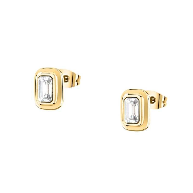 Náušnice Trussardi představují dokonalou kombinaci elegance a kvality. Vyrobené z odolné oceli s luxusním zlatým PVD pokovením, tyto pecky zdobí čirý kubický zirkon se smaragdovým brusem, který přitahuje pozornost. S výškou 1 cm a praktickým zapínáním na puzetku se stanou nadčasovým klenotem ve vaší kolekci šperků. Ideální pro každodenní nošení i speciální příležitosti.