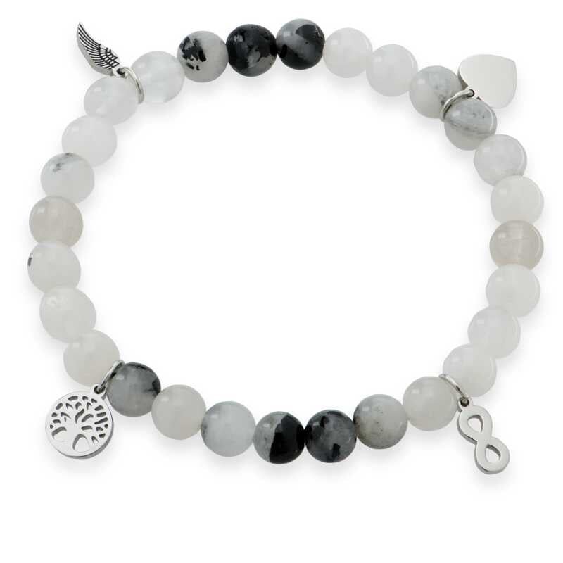 Elegantní náramek značky Troli přináší spojení přírodních krás a symboliky. Korálky z rutilovaného křemene, o průměru 0,6 cm, dodávají tomuto šperku jedinečný vzhled, zatímco čtyři přívěsky – srdce, andělské křídlo, strom života a symbol nekonečna – obohacují jeho design. Pružné provedení...