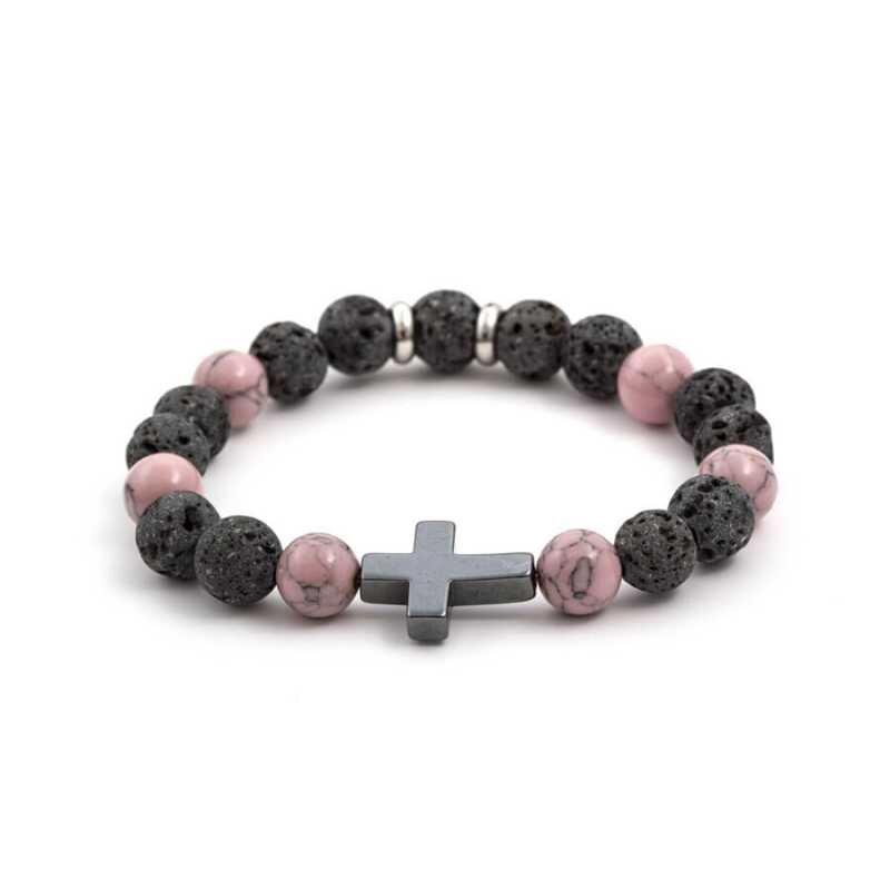 Elegantní náramek pro ženy od značky Agato spojuje minerální korálky s ocelí, čímž vytváří jedinečný šperk. Růžový howlit a černé lávové kameny se zdobným stříbrným křížkem z hematitu nejen skvěle vypadají, ale také poskytují harmonii a ochranu. Díky pružné gumičce se náramek pohodlně nosí a...