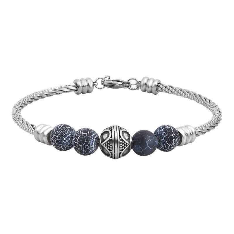 Stylový náramek značky Troli spojuje eleganci a kvalitu díky pevnému provedení z kvalitní oceli. Dominantou je střed náramku, zdobený tmavě modrými korálky s bílým vzorem, které dodávají šperku unikátní vzhled. Detailně zpracovaný ocelový korálek podtrhuje jeho luxusní charakter. S průměrem 6 - 8...