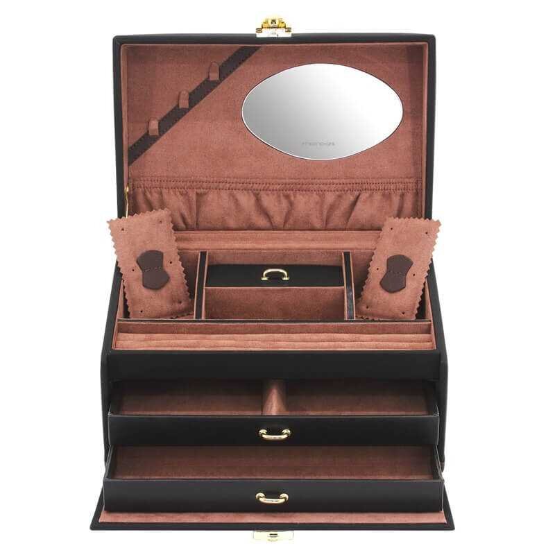 Elegance a funkčnost se snoubí v klasické šperkovnici značky Friedrich Lederwaren. Černo-hnědé provedení s hnědým interiérem z mikroflauše zajišťuje dokonalou ochranu vašich šperků. Praktické zrcátko ve víku a automatická výsuvná přihrádka přispívají k snadnému přehledu a organizaci. Ukládejte své šperky stylově a s péčí, kterou si zaslouží.
