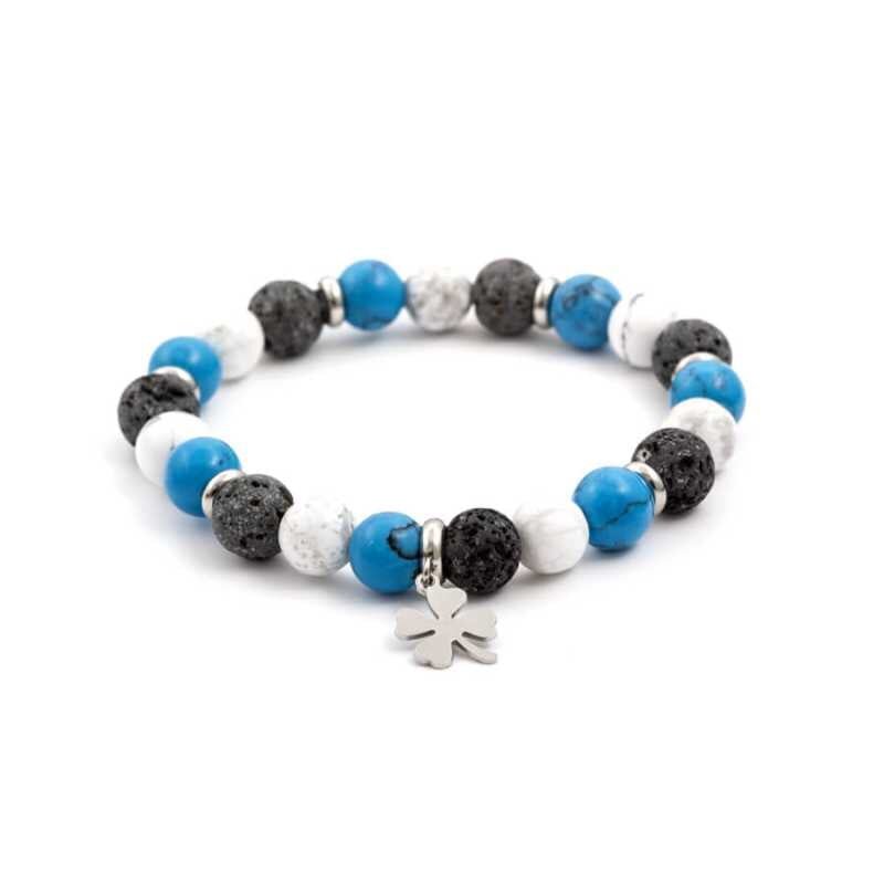 Elegantní náramek Agato je ideálním doplňkem pro každou ženu, která hledá harmonii a styl. Složený z bílého a modrého howlitu a šedých lávových kamenů, tento šperk vyniká ocelovým přívěskem ve tvaru čtyřlístku. Díky pružné gumičce se pohodlně nosí a perfektně padne na zápěstí. Kromě estetického...