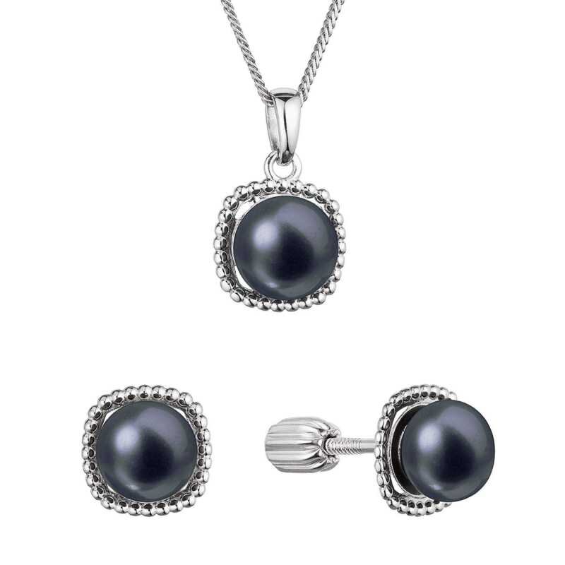 Sada stříbrných šperků s černými říčními perlami 29065.3B black (náušnice, řetízek, přívěsek) Evolution Group