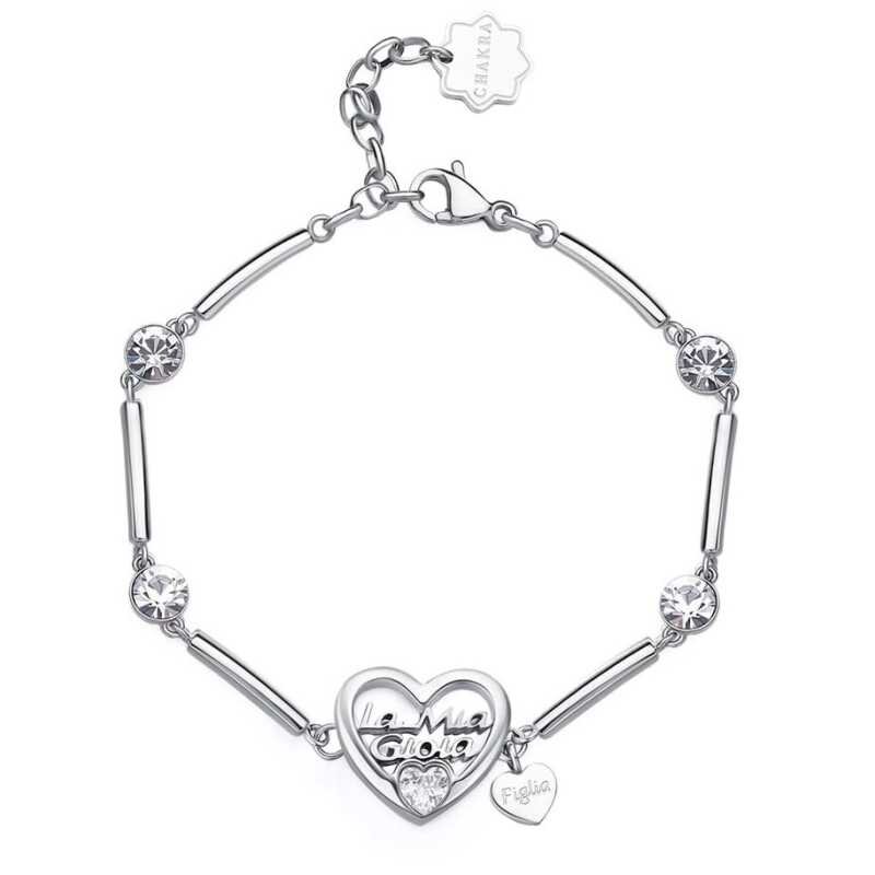 Náramek značky Brosway představuje elegantní spojení kvalitní oceli 316L a emotivních symbolů. Dominantou je srdíčková ozdoba s nápisem "La mia gioia" (Moje radost) a jemný přívěsek s nápisem "Figlia" (Dcera), které společně vyjadřují vaše city. Přesné kulaté krystaly dodávají náramku třpytivý...
