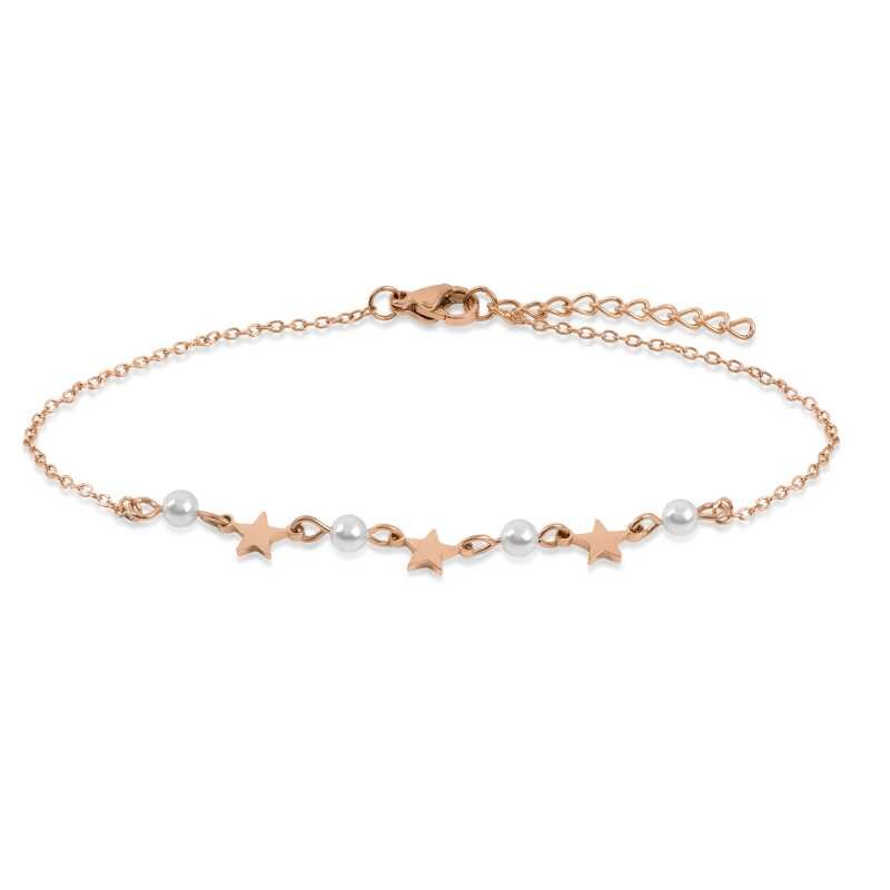 Náramek na nohu značky Troli je elegantním doplňkem, který podtrhne vaši ženskost. Je vyroben z kvalitní oceli a pozlacen růžovým zlatem, což mu dodává šarmantní vzhled. Syntetické perly a drobné hvězdičky tvoří dokonalou harmonii, zatímco nastavitelná délka 21 + 5 cm zajišťuje pohodlné nošení. Tento náramek je ideální volbou pro každou příležitost, kdy chcete zazářit.