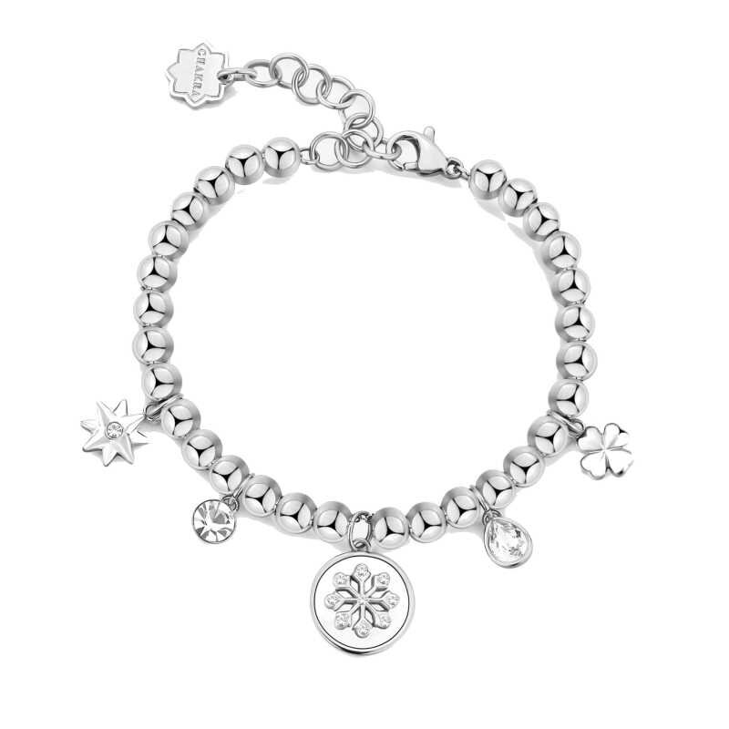 Elegantní korálkový náramek značky Brosway je vyroben z kvalitní oceli, což zajišťuje jeho dlouhou životnost a odolnost. Doplňuje ho jedinečná kombinace přívěsků s motivy hvězdy, sněhové vločky a čtyřlístku, které společně s čirými krystaly dodávají náramku šarm a jedinečnost. Délka 18 cm a...