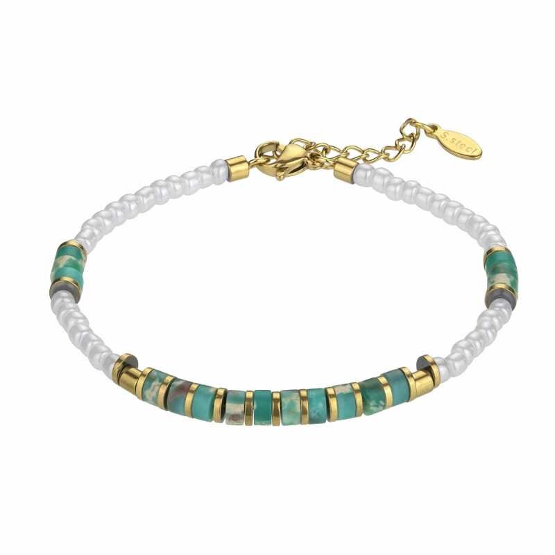 Náramek značky Emily Westwood kombinuje eleganci s moderním designem, jehož základem jsou korálky z chryzoprasu a kvalitní ocelové komponenty s žlutou zlatou úpravou. S délkou 21 cm se skvěle přizpůsobí každému zápěstí a osvěží váš styl. Tento nadčasový šperk je ideální volbou pro sebe i jako dárek pro vaše blízké, čímž přináší do každodenního nošení nádech luxusu.