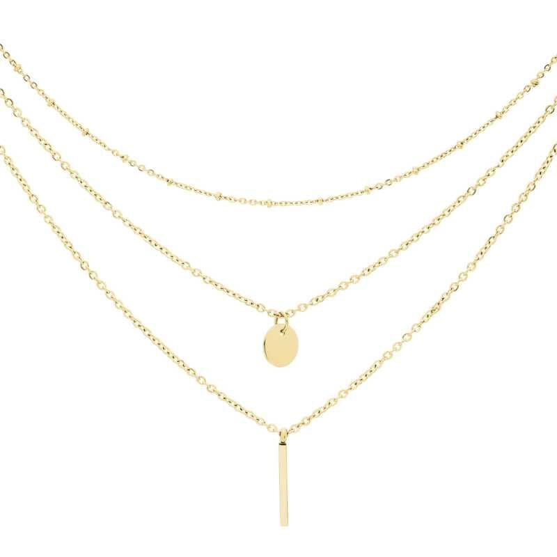 Pozlacený náhrdelník značky Troli přináší eleganci do každého outfitu. Složen ze tří jemných řetízků, z nichž jeden zdobí drobné korálky, zatímco další dva jsou obohaceny stylovými přívěsky. Průměr kruhového přívěsku činí 1 cm a délka náhrdelníku je nastavitelná až na 38,5 cm. Tento módní šperk, vyrobený z kvalitní oceli, se stane skvělým doplňkem pro každou příležitost.