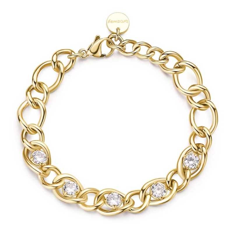 Tento elegantní náramek značky Brosway je ideální volbou pro ženy, které chtějí zvýraznit svou osobnost. Vyrobený z kvalitní oceli a pokovený zlatým PVD povlakem, vyniká masivními propojenými očeky, jež dodávají šperku na robustnosti. Precizně osazené čiré kubické zirkony přidávají luxusní...