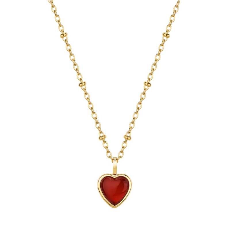 Elegantní dámský náhrdelník značky Brosway je vyroben z kvalitní oceli a pokoven zlatým PVD povlakem, což zaručuje jeho odolnost a lesk. Přívěsek ve tvaru srdce, zdobený červeným achátem, přitahuje pozornost a dodává šmrnc každému outfitu. Drobné korálky na řetízku podtrhují jeho jedinečnost. S...