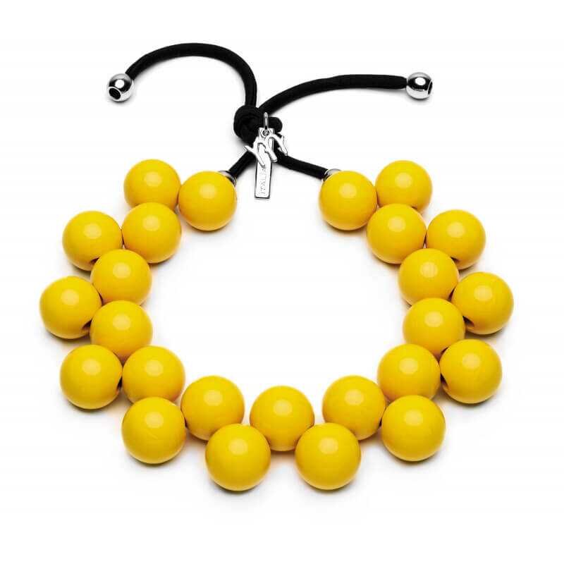 Náhrdelník od italské značky Ballsmania spojuje eleganci s moderním designem. Základem je černá pružná šňůrka, na které jsou umístěny výrazné pryskyřicové korálky ve žluté barvě, každý o velikosti přibližně 2,5 cm. Díky pružnosti šňůrky se náhrdelník dokonale přizpůsobí tvaru vašeho krku. Tento nadčasový šperk oživí váš outfit a dodá mu jedinečný styl.