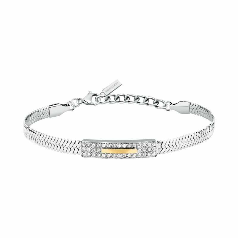 Dámský náramek značky Trussardi spojuje eleganci s moderním designem. Vyroben z kvalitní oceli, jeho povrch je částečně pokoven zlatým PVD, což zajišťuje dlouhotrvající lesk. Náramek je zdoben oslnivými krystaly, které podtrhují jeho jedinečnost. S délkou 16 cm a možností prodloužení až o 3 cm se...