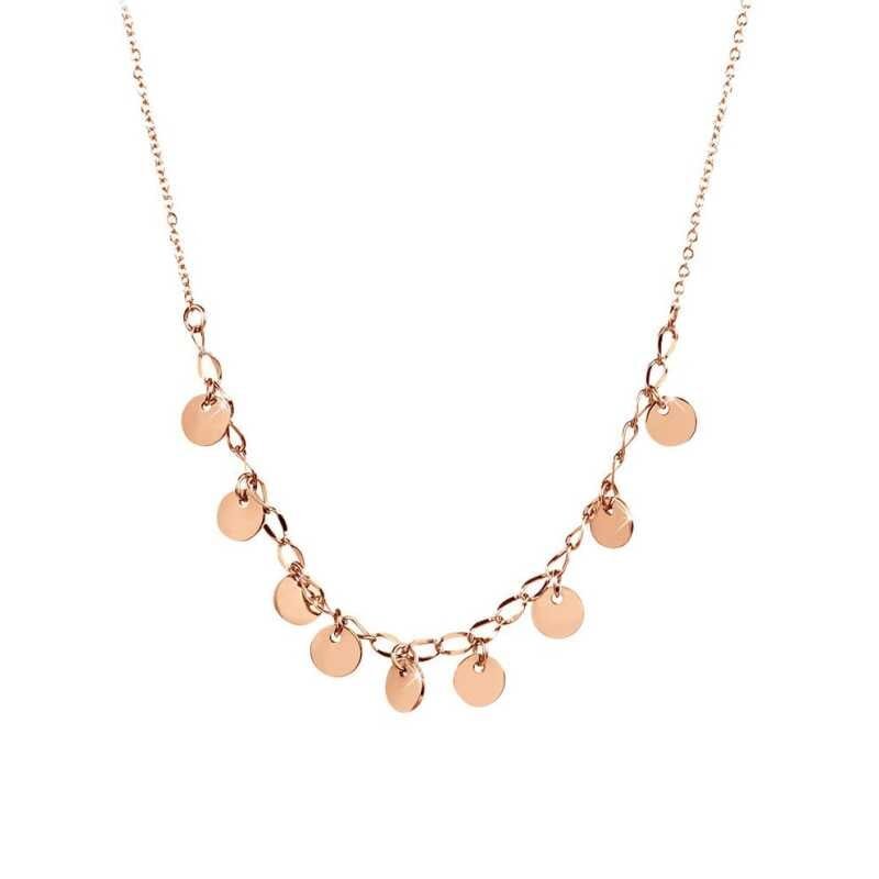 Elegantní náhrdelník značky Troli přináší do vašeho šperkového arzenálu styl a jemnost. Je vyroben z kvalitní růžově pozlacené oceli a zdoben drobnými penízky o průměru 0,6 cm, které dodávají šperku zajímavý vizuální efekt. S délkou 40 cm a možností prodloužení o 5 cm se skvěle přizpůsobí každému dekoltu. Tento nadčasový kousek je ideální volbou pro každou příležitost.