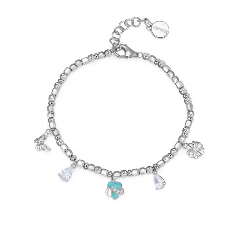 Elegantní náramek od italské značky Rosato spojuje kvalitu a styl. Je vyroben z prvotřídního stříbra a jeho rhodiovaný povrch zajišťuje dlouhotrvající lesk a minimalizuje alergické reakce. Složený ze stříbrných korálků různých tvarů a okouzlujícími přívěsky ve tvaru květin, motýlka a slziček...