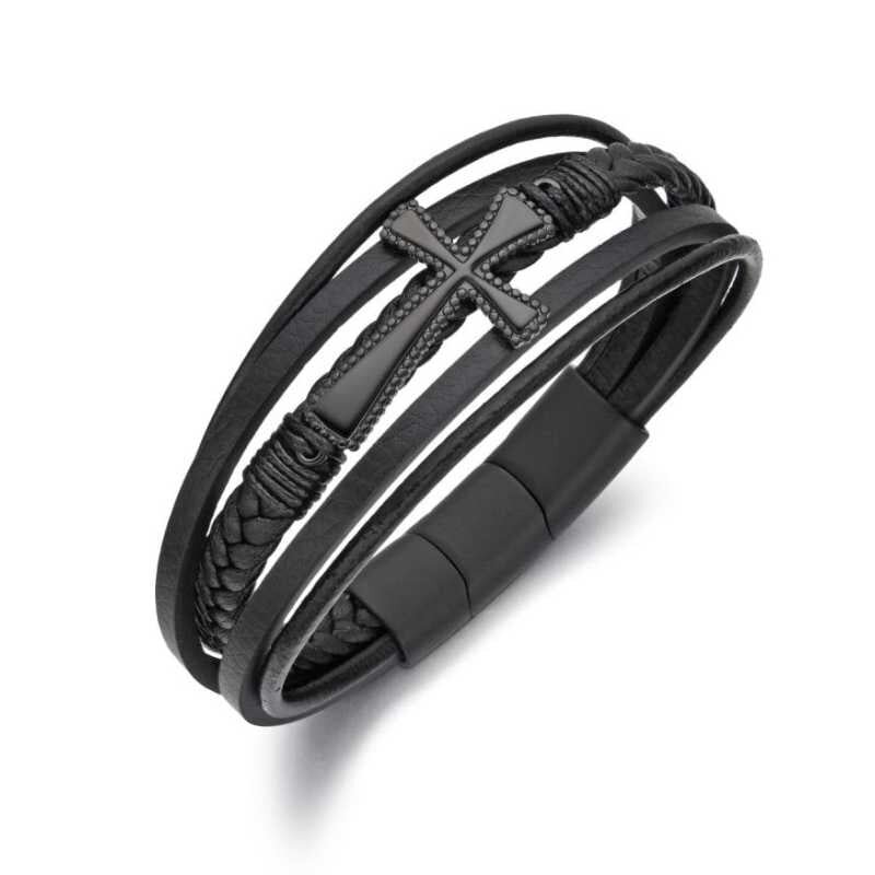 Černý kožený náramek pro muže Křížek B1000852 Diverse