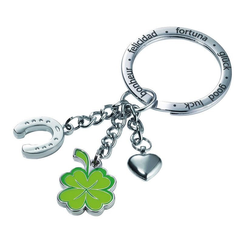Klíčenka se 3 přívěsky - podkova, čtyřlístek a malým srdcem. XL kroužek s rytinou „good luck“ v různých jazycích. Zeleno-stříbrnné provedení. • rozměry: 105 x 45 x 6 mm • hmotnost: 35 g • motiv štěstí - podkova, čtyřlístek, srdíčko • vhodná i jako dárek • XL kroužek s rytinou weiter lesen