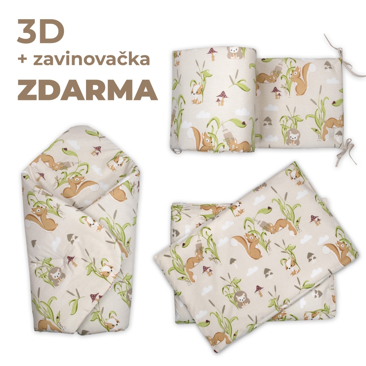 3D Mantinel s povlečením + zavinovačka zdarma, Veverky, béžová, šedá; béžová, šedá; bavlna,hypoalergenní duté vlákno