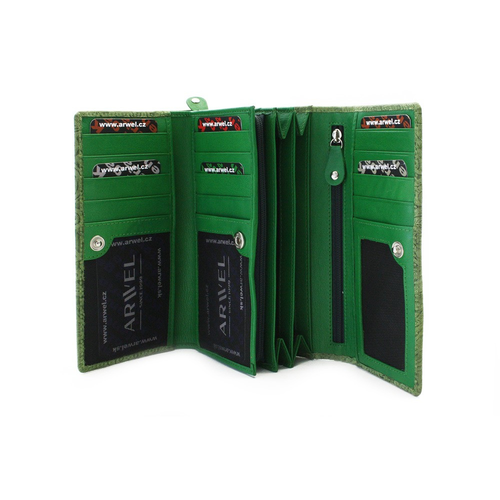 Atraktivní dámská velká peněženka od české značky Arwel.Vlastnosti:• 2 přihrádky na bankovky• vnitřní rozdělená zipová kapsa na mince• 12 kapes na platební karty či doklady• 5 otevřených kapes• 3 průhledné okna• na zadní vnější straně je zipová kapsa• zapínání na klopnu s ozdobným kováním...