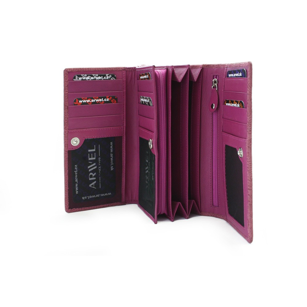 Atraktivní dámská velká peněženka od české značky Arwel.Vlastnosti:• 2 přihrádky na bankovky• vnitřní rozdělená zipová kapsa na mince• 12 kapes na platební karty či doklady• 5 otevřených kapes• 3 průhledné okna• na zadní vnější straně je zipová kapsa• zapínání na klopnu s ozdobným kováním...