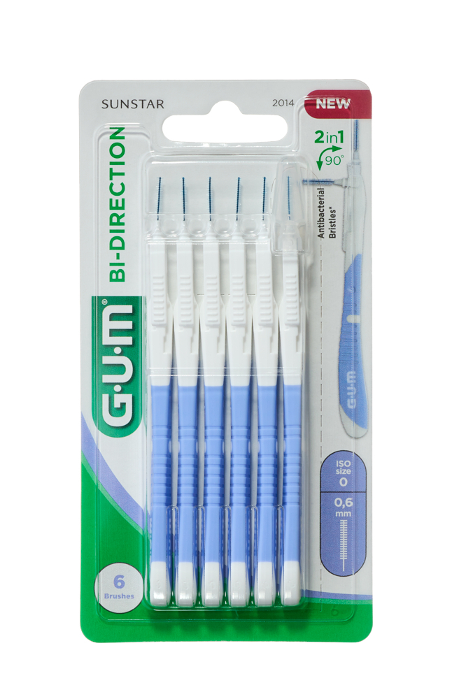 GUM BI-DIRECTION mezizubní kartáčky 0,6 mmVyužívá revoluční japonskou technologii, díky které je možné pouhým posunutím vytvořit pravý úhel mezi mezizubním kartáčkem a držátkemodstraní až o 25 % více plaku díky inovativnímu profilu nylonového vlákna do trojúhelníkuergonomická rukojeť z měkké gumy...
