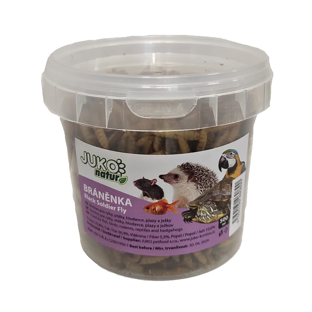 100 % přírodní doplňkové krmivo.Sušené larvy bráněnky jsou přírodní potravou pro velkou skupinu živočichů, např. ptáků, ryb, plazů ale i drobných savců, jako jsou ježci, myši nebo potkani.Jedná se o vhodnou alternativu k moučnému červu.Obsahují kvalitní proteiny (36 %) a tuky (37 %). Jsou zdrojem...