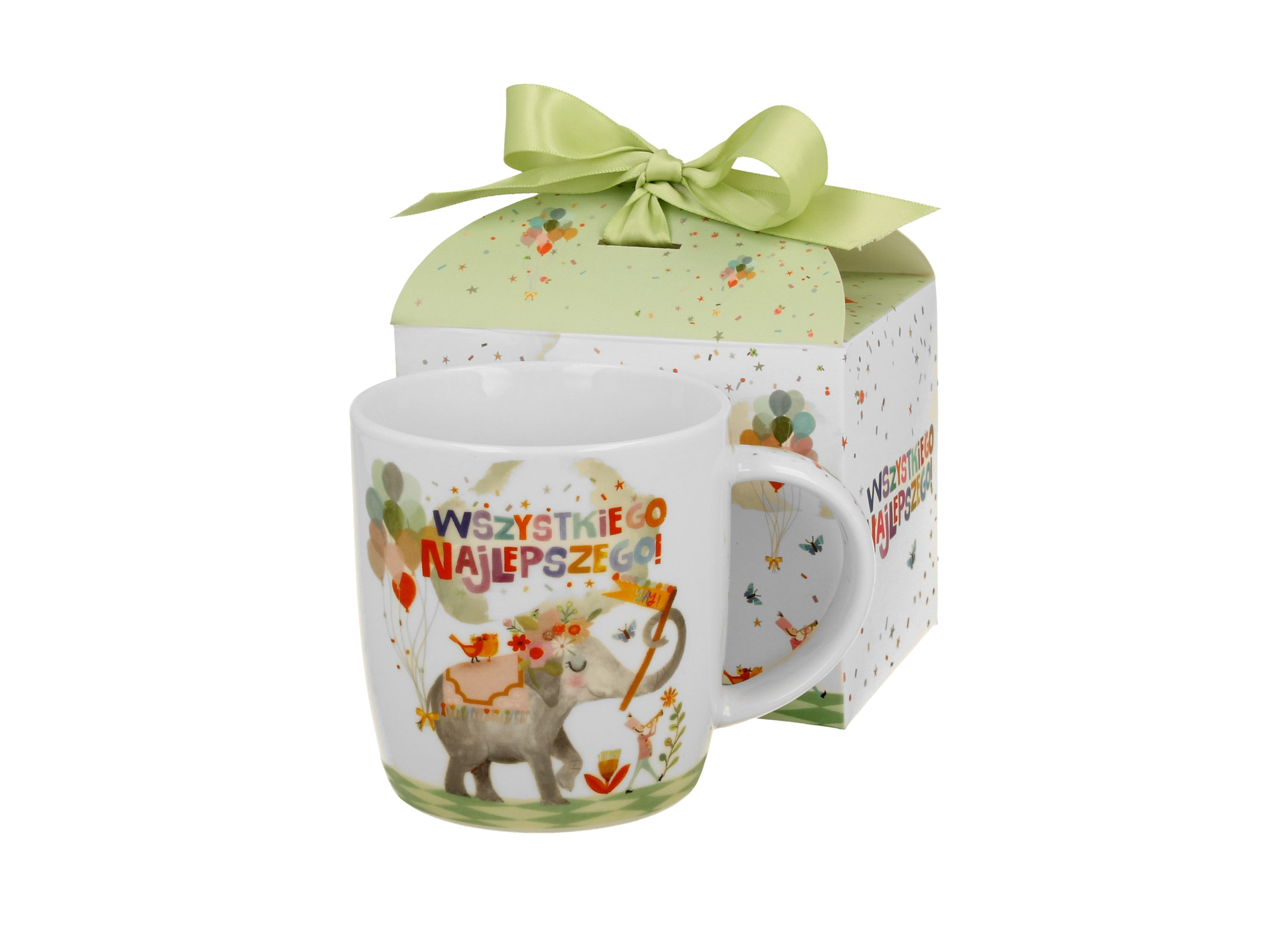 Kubek okazjonalny "WSZYSTKIEGO NAJLEPSZEGO" w pudełku z kokardą, wchodzący w skład serii Okolicznościowej, charakteryzuje się naturalnym kremowo-białym kolorem z delikatnym połyskiem oraz wyjątkową wytrzymałością i trwałością, zachowując lekkość i finezję.Kubek zdobiony kolorową grafiką słonika...