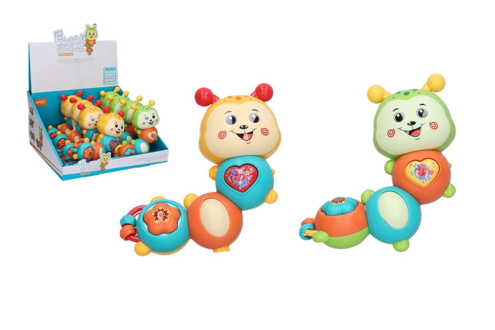 Chrastítko housenka s efekty plast 14cm na baterie se zvukem 2 barvy 8ks v boxu