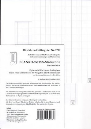 Mit unseren beschreibbaren Markieraufklebern kennzeichnen Sie in Ihrem Gesetz die Vorschriften, die Sie für wichtig halten und behalten so nicht nur in den Klausuren einen guten Überblick über Ihr Gesetz. 96 weisse, beschreibbare Markieraufkleber zur Befestigung an Trennblättern oder Buchseiten.... weiter lesen