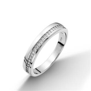 Překrásný stříbrný prsten dekorovaný kubickými zirkony čiré barvy. Prsten se směrem do dlaně zužuje z 3,5 mm na 2,5 mm