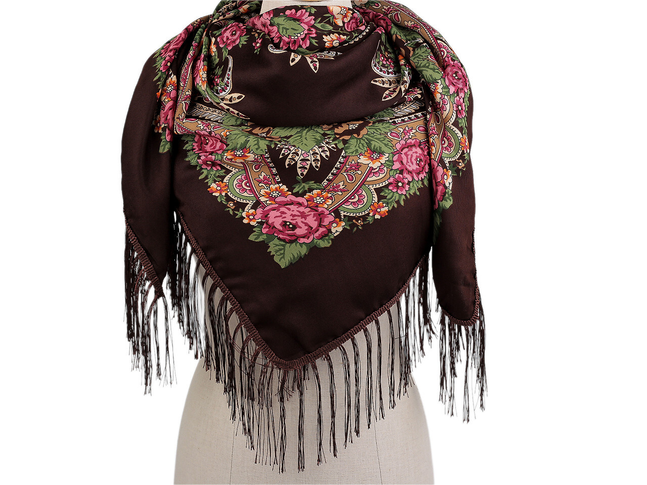 Šátek folklór květy s třásněmi 105x105 cm - 1 ks - 17 hnědá