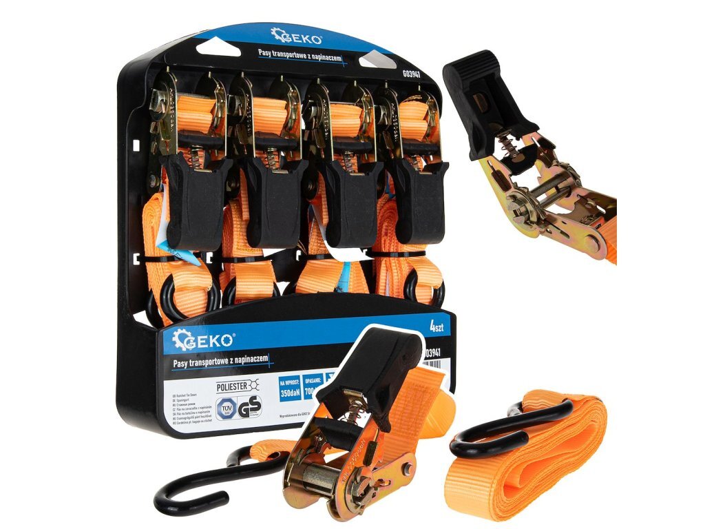 Pás upínací ráčnový, s háky, 25 mm × 4,5 m, 700 kg, sada 4 ks - GEKO