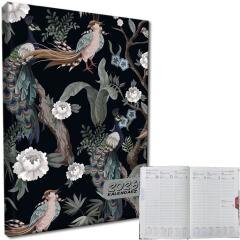 kalendarz formatu A5, układ tygodniowy, okładka aksamitna soft touch, papier chamois każdy tydzień roku znajduje się na rozkładówce kalendarza terminarze miesięczne na początku i na końcu kalendarza podziału godziny 7:00 - 21:00 język polski, angielski, niemiecki, francuski, rosyjski imieniny...
