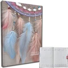 kalendarz formatu A5, układ tygodniowy, okładka aksamitna soft touch, papier chamois każdy tydzień roku znajduje się na rozkładówce kalendarza terminarze miesięczne na początku i na końcu kalendarza podziału godziny 7:00 - 21:00 język polski, angielski, niemiecki, francuski, rosyjski imieniny...