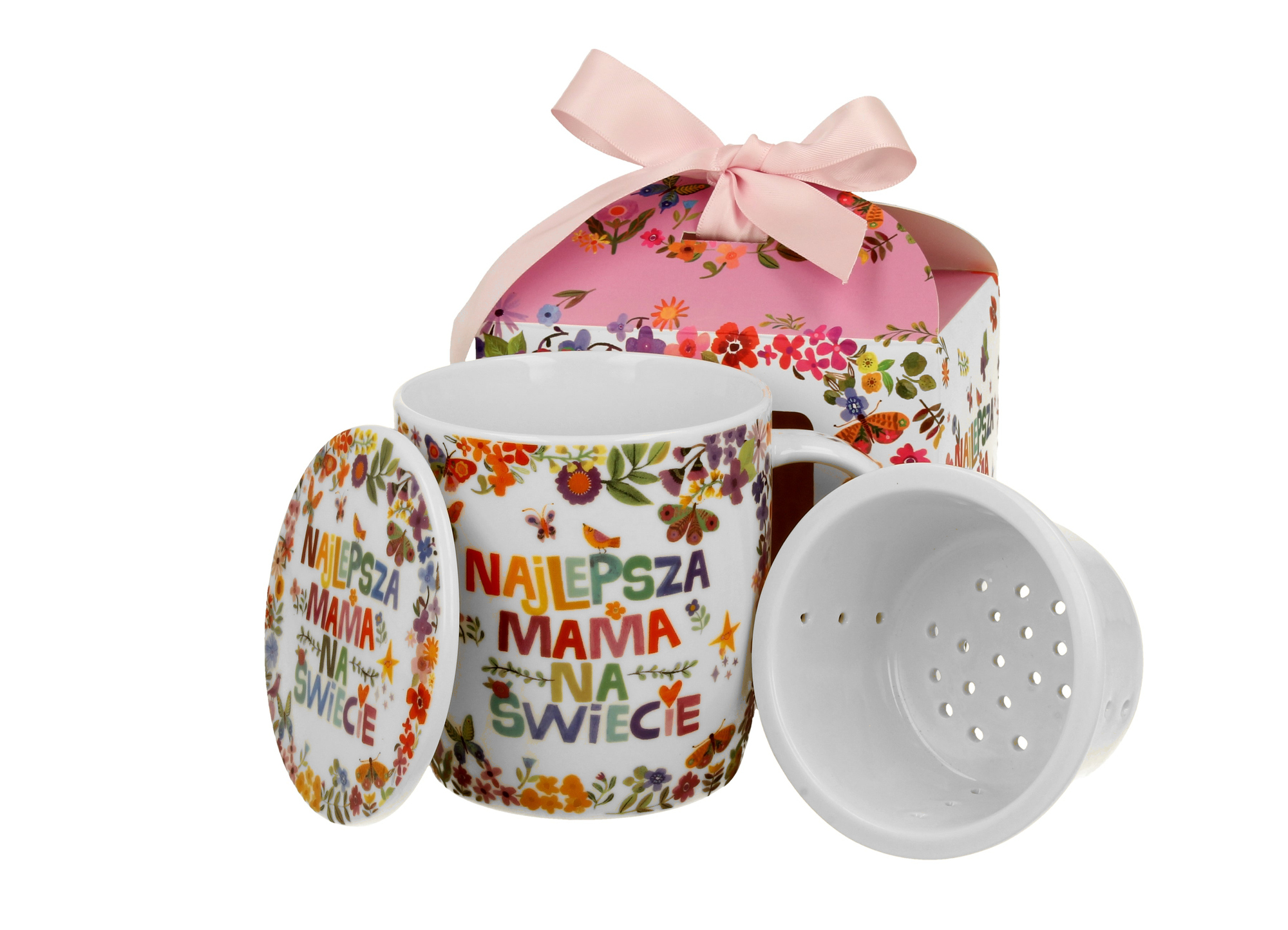 Kubek okazjonalny z zaparzaczem "NAJLEPSZA MAMA" w pudełku z kokardą