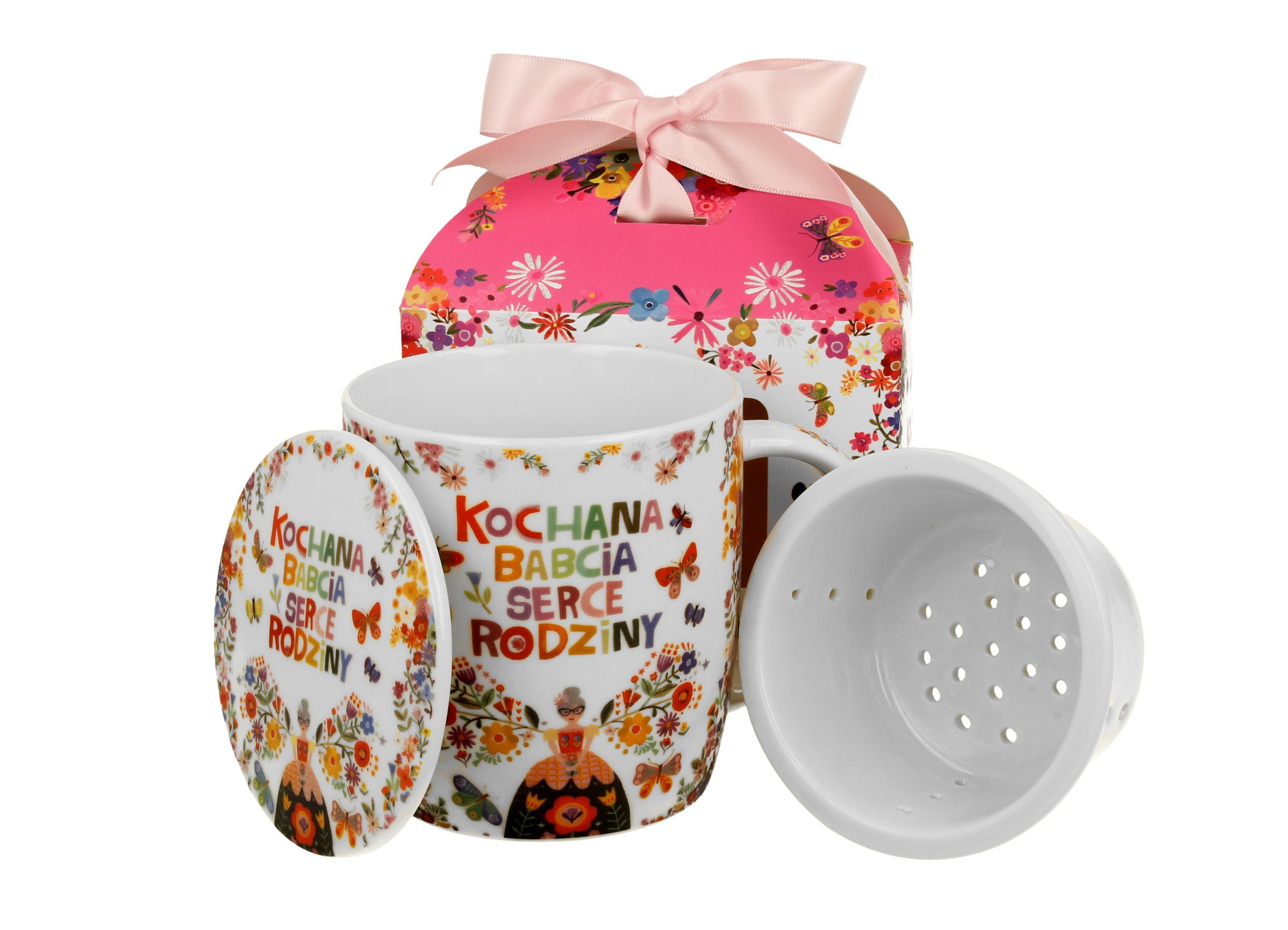 Kubek okazjonalny z zaparzaczem "KOCHANA BABCIA" w pudełku z kokardą