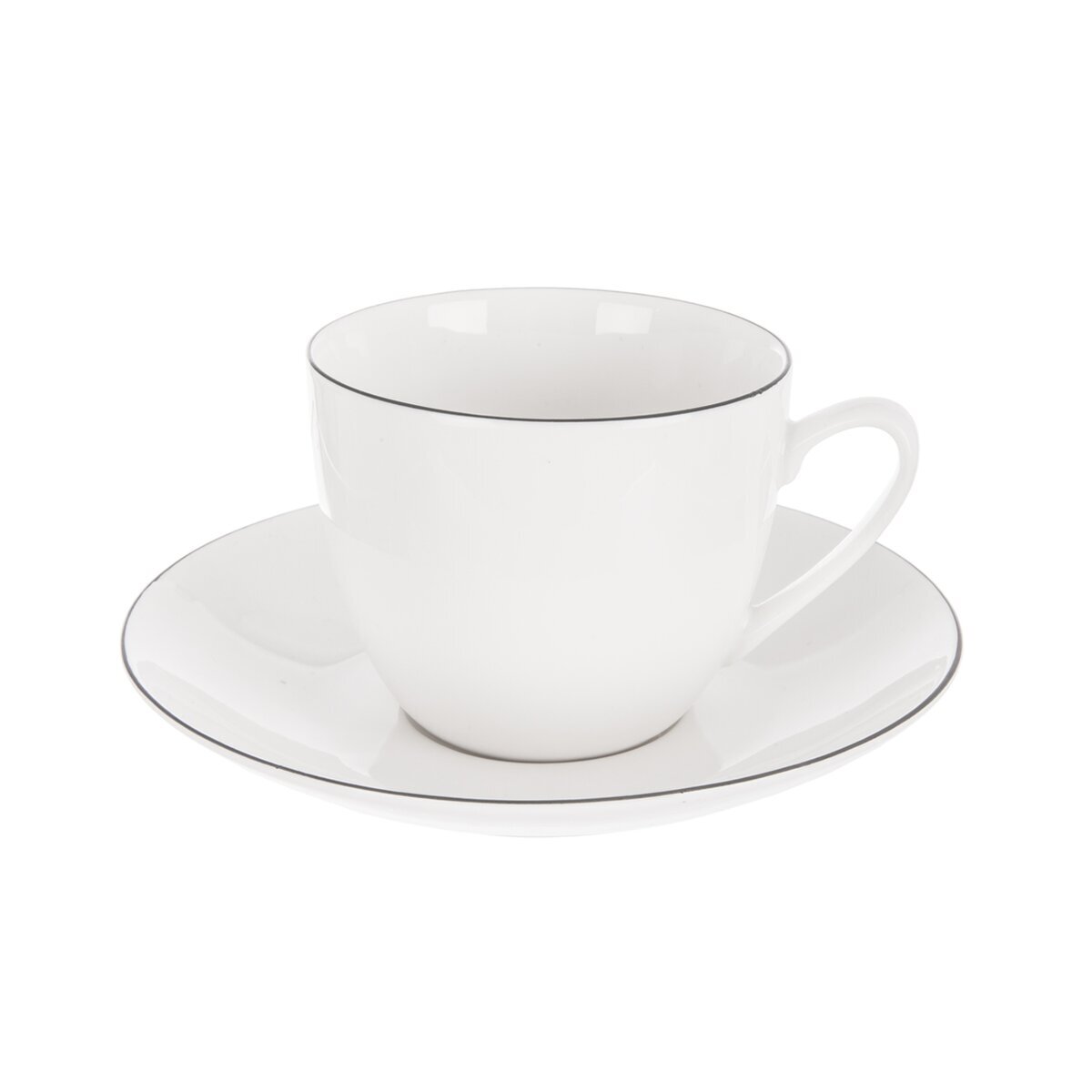 Elegantní porcelánový hrnek s podšálkem má hladký bílý povrch a je zdoben jemnou černou linkou po okraji, která podtrhuje jeho vytříbený vzhled. Sada 2 hrnečků a 2 podšálků. Ideální na cappuccino – stylový doplněk pro každého milovníka kávy. Materiál: New Bone China – velmi kvalitní, pevný a...
