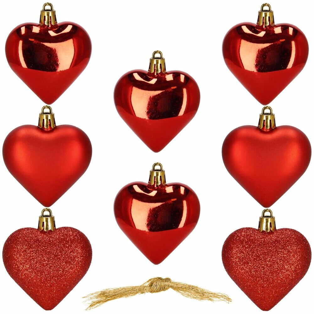 Sada vánočních ozdob ve tvaru srdíček v červeném provedení dodá vaší výzdobě hřejivý a slavnostní vzhled. Ideální jako dekorace na vánoční stromeček, sváteční stůl nebo do oken. Vyrobeny z nerozbitného plastového materiálu, vhodné pro vnitřní i venkovní použití. Součástí balení jsou poutka pro...