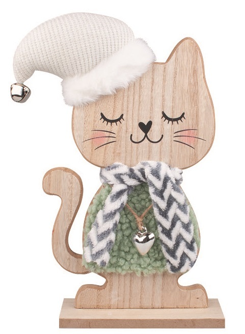 Kočka v zeleném kožíšku, dřevěná na postavení, 17 x 27,5 x 6 cm Tato stylová dřevěná kočka v zeleném kožíšku je výraznou dekorací, která přinese do vašeho domova kouzlo zimních dnů i hravý nádech. Díky kombinaci přírodního dřeva a jemných barevných detailů působí mile a elegantně zároveň....