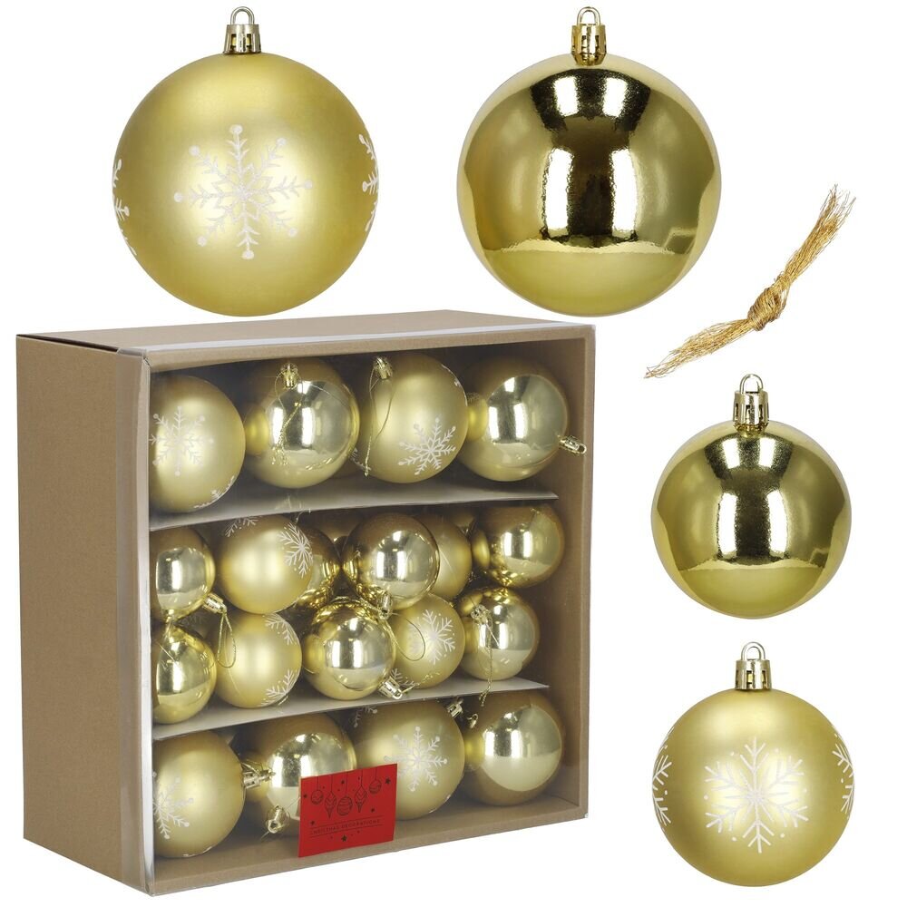 Stylová sada vánočních ozdob v lesklém a matném zlatém provedení s bílým vzorem sněhové vločky. Koule různých velikostí jsou ideální na vánoční stromeček i jako doplněk do svátečních aranžmá. Vyrobeny z nerozbitného plastu, bezpečné pro vnitřní i venkovní použití. Součástí balení jsou poutka na...